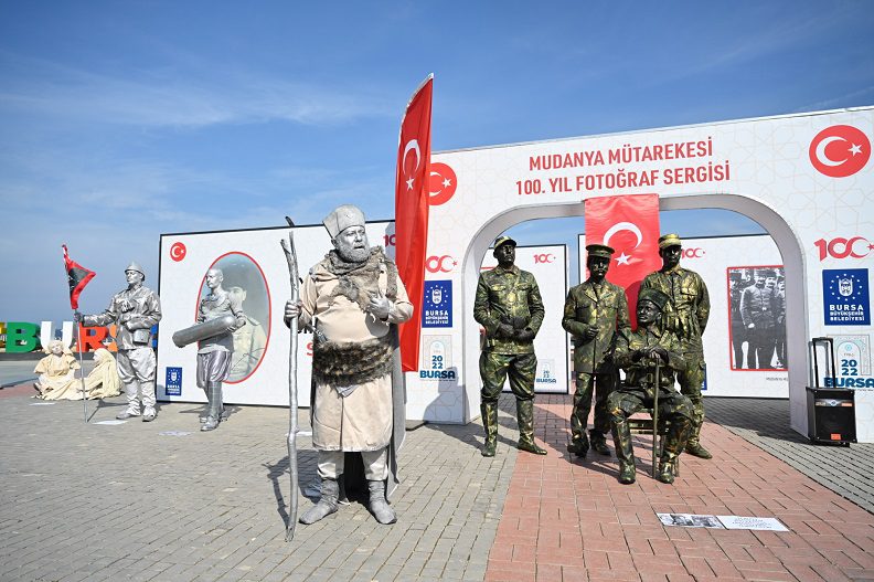 Mudanya Mütareke Evi’nde gerçekleştirilen barış görüşmelerini ve Cumhuriyetin ilk yıllarında tarihi bina önünde yapılan kutlama etkinliklerini konu alan görseller, Mudanyalılar tarafından ilgiyle izlendi. Büyükşehir Belediye Başkanı Alinur Aktaş, Mudanya Kaymakamı Ayhan Terzi ve Uludağ Üniversitesi Rektörü Prof.Dr. Ahmet Saim Kılavuz ile birlikte fotoğraf sergisini gezdi. Sergi alanında Sokak Sanatları Atölyesi’nin 15 kişilik ekiple yaptığı canlı heykel gösterisi, vatandaşlar tarafından ilgiyle izlendi. Vatandaşlar canlı heykellerle hatıra fotoğrafı çektirmek için adeta sıraya girerken, saat başı yapılan canlı performanslarla Mudanya Mütarekesi anlatıldı.