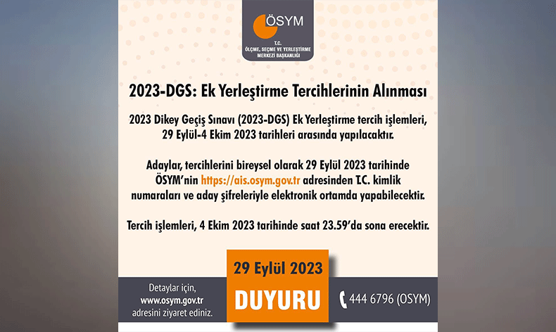 ÖSYM’den yapılan açıklamaya göre, 2023-DGS ek yerleştirme tercih işlemleri başladı.
