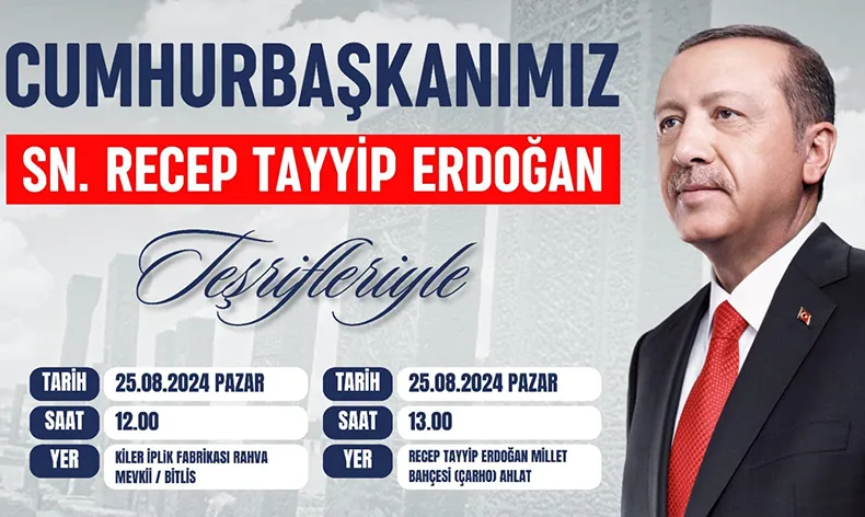 Cumhurbaşkanı Erdoğan bugün öğlen saatlerinde Bitlis il merkezine geçerek burada kamu ve özel sektör yatırımlarının toplu açılış törenlerine katılacak. Daha sonra Ahlat’a geçecek olan Erdoğan burada ilk olarak Selçuklu Meydan Mezarlığını ziyaret edecek ve akabinde ilçenin Çarho mevkiinde bulunan Recep Tayyip Erdoğan Millet Bahçesi’nde kurulan 1071 Sultan Alparslan Otağı’ndaki alanda halka seslenecek.