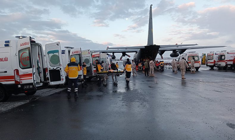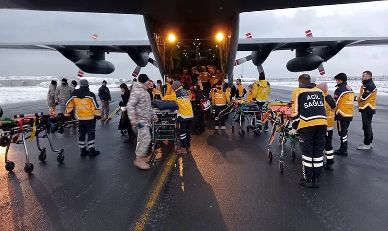 Kahramanmaraş merkezli 7.7 ve 7.6 büyüklüğündeki depremlerin ardından enkaz altında kalanları kurtarma çalışmaları sürüyor. Malatya’da aralarında çocukların da olduğu 44 yaralıyı alan Türk Silahlı Kuvvetleri’ne ait askeri nakliye uçağı, saat 08.00 sıralarında Atatürk Havalimanı Askeri Apronu’na iniş yaptı. Askerlerin de yardımıyla uçaktan indirilerek ambulanslara bindirilen yaralılar, çevredeki hastanelere götürüldü.