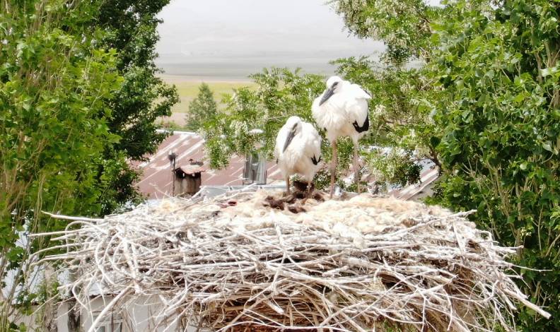 Van’ın Özalp ilçesine bağlı Yukarı Dönerdere Mahallesi’ni mesken tutan leylekler, yaklaşık 46 yıldır aynı direkte konaklıyor. Mahalle sakinlerinden İsmail Genel’in bahçe duvarının yanındaki elektrik direğindeki yuvada kuluçkaya yatan leylekler, 4 yavru dünyaya getirdi. Bu yıl dünyaya getirdikleri 4 yavrudan ikisi yuvadan düşerek telef oldu. Yaz boyunca akarsularda ve mahallenin hemen yanı başında bulunan göletten avladıkları balık, kurbağa ve yılanlarla yavrularını besleyen leylekler, vatandaşlar tarafından da yemleniyor.