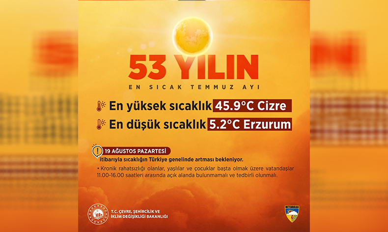 Çevre, Şehircilik ve İklim Değişikliği Bakanı Murat Kurum, sosyal medya hesabından yaptığı paylaşımda, “Meteoroloji Genel Müdürlüğümüzün verilerine göre son 53 yılın en sıcak Temmuz ayını yaşadık. En yüksek sıcaklık 45.9 derece ile Cizre’de, en düşük sıcaklık 5.2 derece ile Erzurum’da tespit edildi. Önümüzdeki hafta Pazartesi gününden itibaren de hava sıcaklıkları artmaya devam edecek. Bu nedenle vatandaşlarımızdan daha tedbirli olmalarını rica ediyorum” dedi.