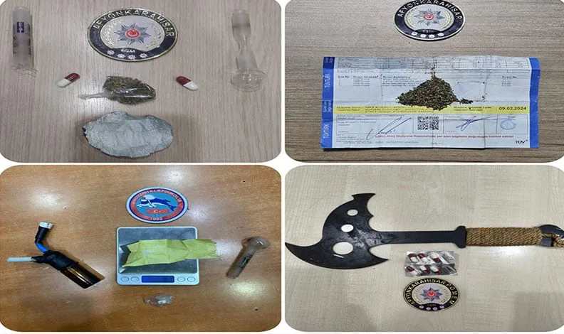 Afyonkarahisar İl Emniyet Müdürlüğüne bağlı ekipler metruk alanlarda şok uygulama yaptı. Bu çerçevede İ.A, A.Ç, Ü.S.D ve S.Ö isimli 4 şüpheli şahısın üzerinden ve araçlarından çeşitli miktarlarda sentetik uyuşturucu maddesi çıkarken, esrar, metanfetamin ve uyuşturucu içmekte kullanılan aparatlar ele geçirildi. Olayla ilgili soruşturma sürüyor.