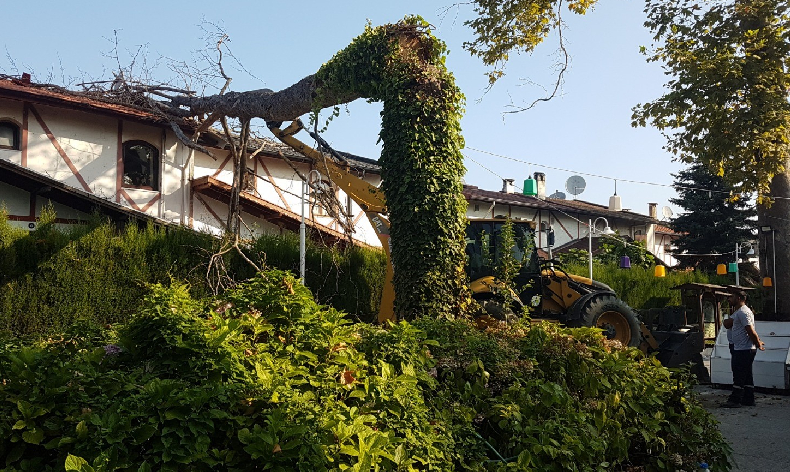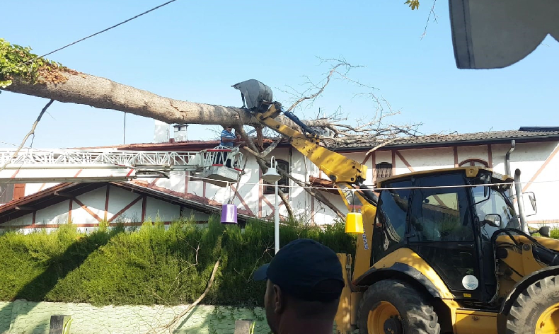 Ekiplerce etrafında güvenlik önlemi alınan ağaç, iş makinesine bağlanarak kesildi. Olayda herhangi bir yaralanma yaşanmazken, villanın çatısında maddi hasar meydana geldi.