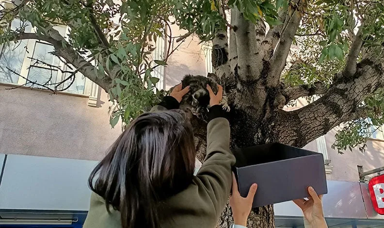 Erzincan merkezde cadde kenarındaki kaldırım üzerinde bulunan ağaçta miyavlayan yavru kedi yoldan geçen vatandaşların dikkatini çekti. Köpeklerden korkup ağaca çıkan yavru kediyi indirmek için Zühal Atalay isimli vatandaş arkadaşıyla birlikte kolları sıvadı. Bir süre aşağı inmemek için direnen yavru kediye daha sonra yaş mama getirilerek koklatıldı. Yaş mamanın kokusunu alan yavru kedi direnişini bırakarak aşağı inmeye ikna edildi.
