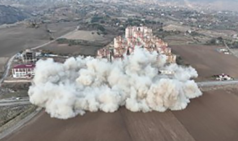 Ekipler sitedeki binaları dinamit patlayıcılar ile uzaktan kumanda yardımıyla yıkıyor. 3 binanın aynı anda patlatılarak yıkımı sonrası çevreyi toz bulutu kapladı. Yıkım çalışması dronla da görüntülendi.
