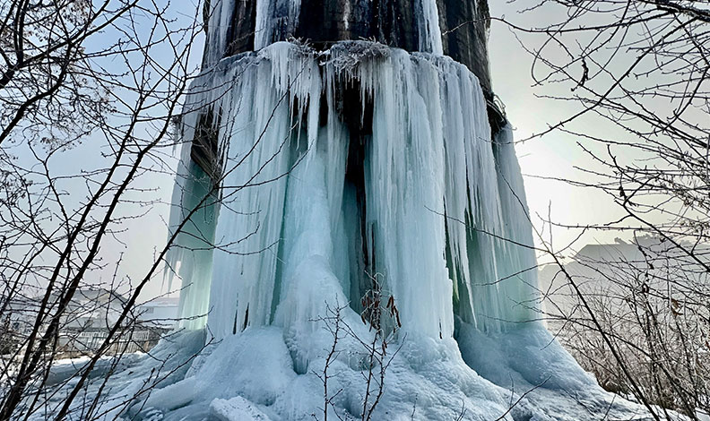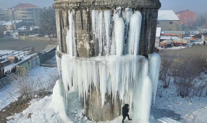 Şehir merkezindeki bir su deposu eksi 20 dereceyi bulan soğuklar nedeniyle tamamen dondu. 15 metre uzunluğunda dev buz sarkıtlarının oluştuğu su deposu görsel şölen sunarken, soğukların ne derece etkili olduğunu gözler önüne serdi.