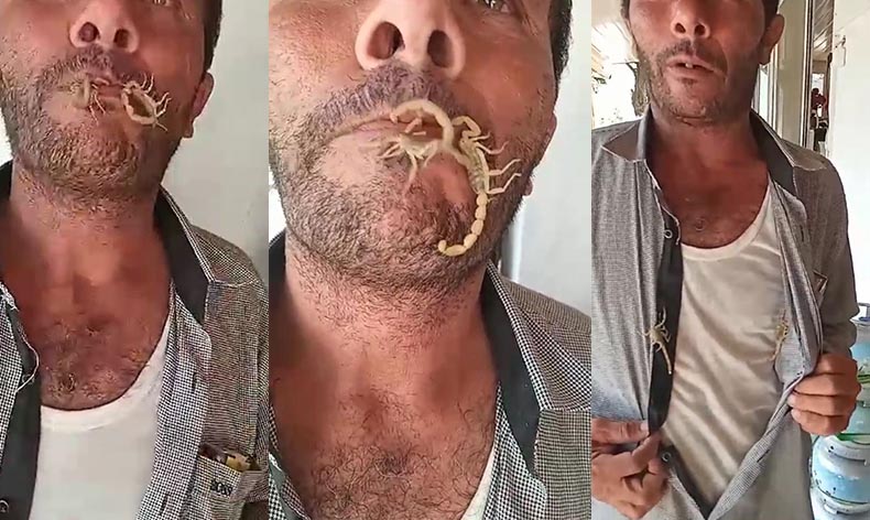 Serik ilçesine bağlı Gebiz Mahallesi Yumaklar Mevkiinde yaşayan orman kesimiyle uğraşan Cemil Özcan’ın yaptığını görenlerin ağzı açık kaldı. Zehirli olduğu ileri sürülen akrepleri üzerinde taşıyan Özcan, bununla da yetinmeyip iki akrebi ağzına alıp kendini sokturdu.