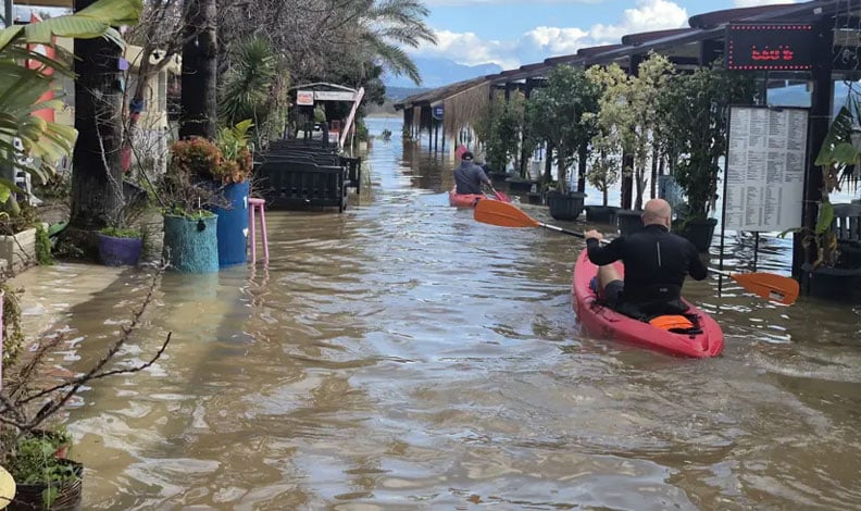 Köyceğiz’de ise göl ile kara birleşti, vatandaşlar ilçenin caddelerinde kanoyla gezdi.