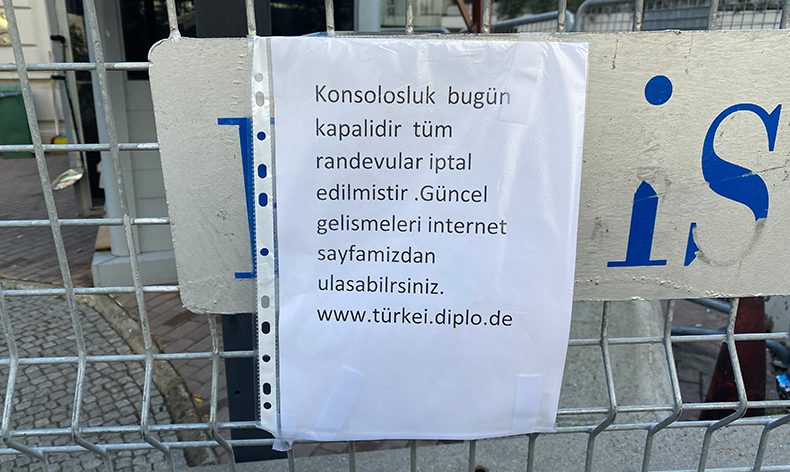 Hollanda ve İngiltere’nin ardından Almanya da İstanbul Başkonsolosluğu’nu “güvenlik endişesi” sebebiyle kapattığını duyurdu. Beyoğlu’nda bulunan konsolosluğun 1 gün boyunca kapalı kalacağı öğrenildi. Taksim Gümüşsuyu’ndaki konsolosluğun girişine de “Konsolosluk bugün kapalıdır. Tüm randevular iptal edilmiştir. Güncel gelişmelere internet sayfamızdan ulaşabilirsiniz” yazısı asıldı.