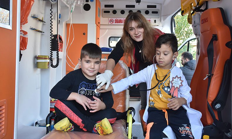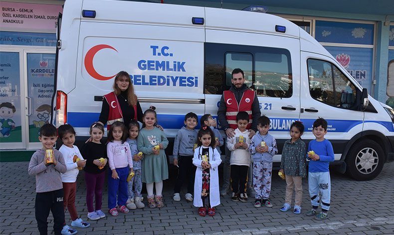 Hasta nakil ambulansını öğrenciler ile buluşturan ekipler, miniklere meyve suyu da ikram ettiler. Gemlik Belediyesi’nde acil tıp teknisyeni ve paramedik olarak görev yapan personel, çocuklara aracı tanıtırken hatıra fotoğrafı da çekildiler.