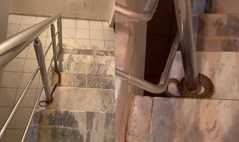 Elazığ’da Doğukent Mahallesi’nde, vatandaşlar bir apartmanın merdiveninde yaklaşık yarım metre uzunluğunda yılan gördü.