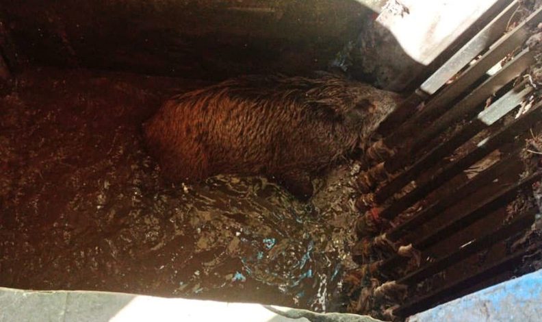 Arıtma tesisine düşen domuz kurtarıldı