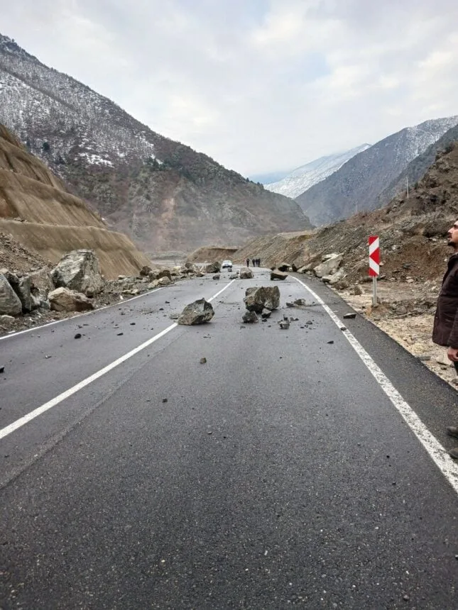Artvin-Şavşat Karayolu’nun 25. kilometresinde heyelan meydana geldi. Yamaçtan kopan toprak ve kaya parçaları karayoluna düşerek ulaşımı kısa süreliğine aksattı.
