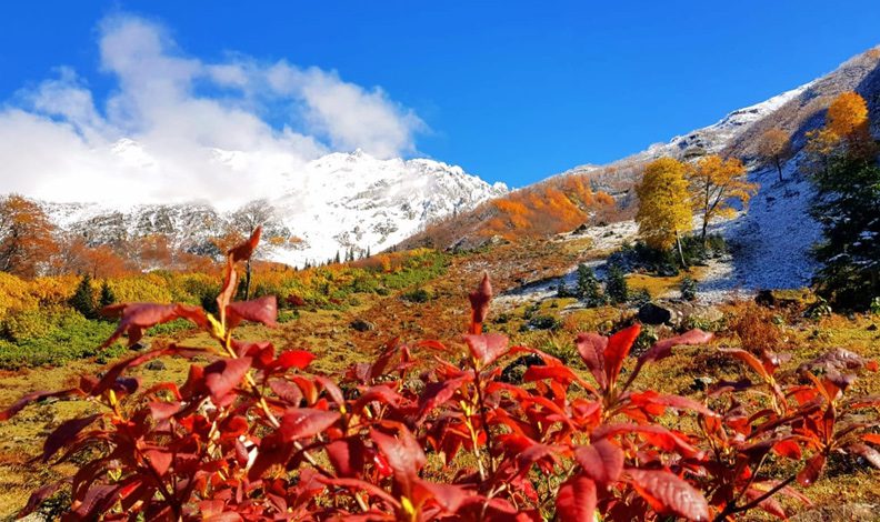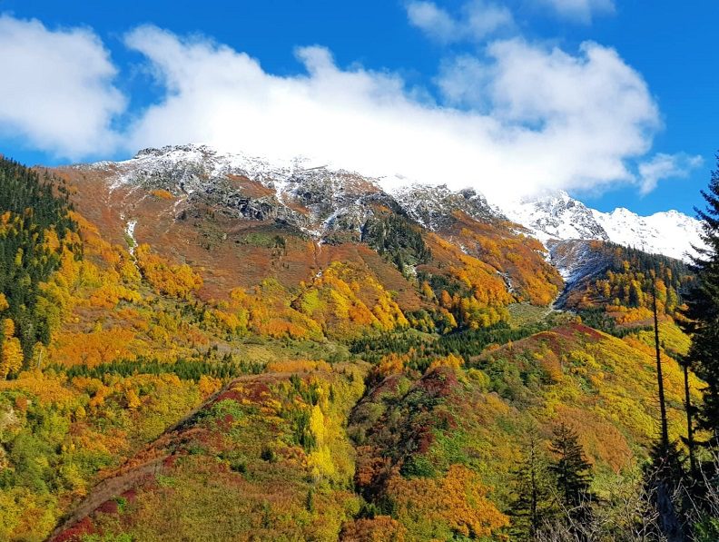 Borçka ilçe merkezine yaklaşık 60 uzaklıkta bulunan bin 700 rakımlı Gorgit Yaylasının bitki örtüsü sarı, yeşil, kırmızı, turuncu ve kahverenginin tonlarına bürünürken 3 bin 415 rakımlı Karçal dağı beyaz örtüyle kaplanınca ortaya çıkan görüntüler yağlı boya tablolarını andırıyor.