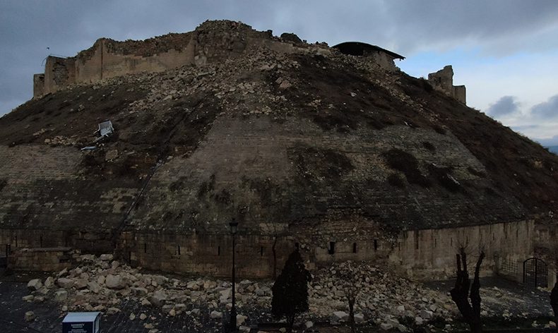 Kahramanmaraş’ta meydana gelen 7,7 ile 7,5 büyüklükteki depremlerden en çok etkilenen illerden biri olan Gaziantep’te bir çok bina yıkılırken asırlık Gaziantep kalesi de harabeye döndü. Surları yıkılan kale havadan dron ile görüntülendi.