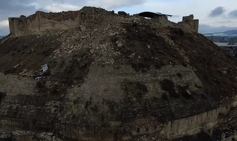 Kahramanmaraş’ta meydana gelen 7,7 ile 7,5 büyüklükteki depremlerden en çok etkilenen illerden biri olan Gaziantep’te bir çok bina yıkılırken asırlık Gaziantep kalesi de harabeye döndü. Surları yıkılan kale havadan dron ile görüntülendi.
