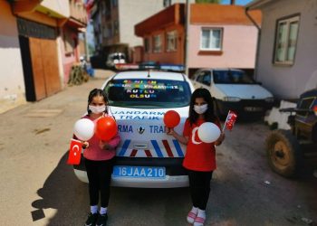 Orhangazi Jandarma Komutanlığına bağlı trafik tim ekipleri, 23 Nisan Ulusal Egemenlik ve Çocuk Bayramını sorumluluk bölgelerinde çocuklarla birlikte kutladı.