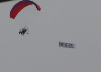 Bursa İnegöl Belediyesi Doğa Sporları Merkezi’nde (DOSTUM) eğitmen İbrahim Dinçer, paramotoruyla gökyüzünde ’Hayat Evde’ pankartı açtı.