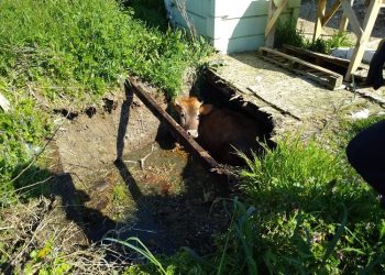 Bursa’nın İznik ilçesinde inşaat alanında otlayan inek, üzeri sunta ile örtülmüş su kuyusuna düştü.