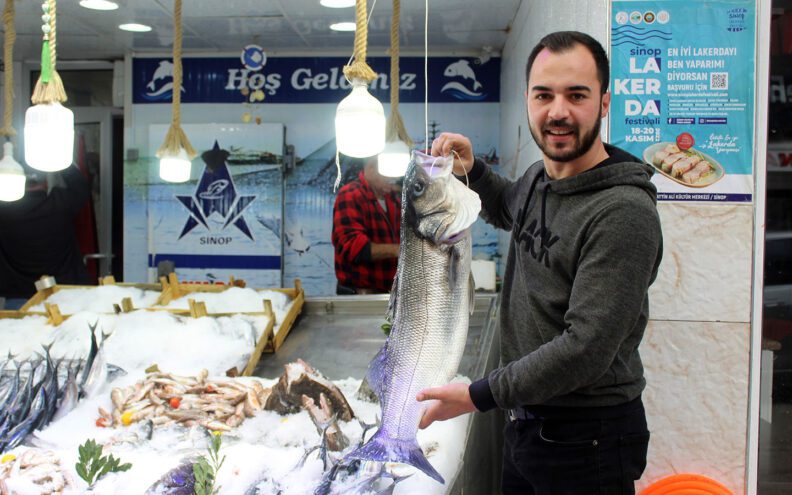 Sinop’ta avlanan balıkçıların ağlarına takılan 7 kilogramlık deniz levreği, büyüklüğüyle görenleri şaşkına çevirdi. İnsan gövdesi uzunluğundaki levrek, kilogramı 300 TL’den tezgahta yerini alarak 2 bin 100 TL’den satışa sunuldu.