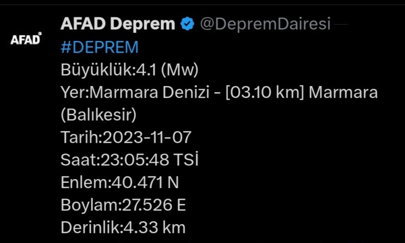 Kandilli Rasathanesi’nin aktardığına göre deprem Balıkesir’in Erdek ilçesinde meydana geldi. Kandilli, depremin büyüklüğünü 4.5 olarak açıkladı.