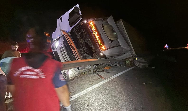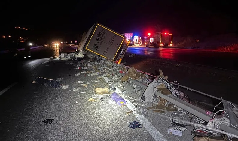 Edinilen bilgiye göre, 34 BOL 932 plakalı tır, sürücüsünün direksiyon hâkimiyetini kaybetmesi sonucu yoldan çıkarak savruldu. Kazada hem çekici bölümü hem de 35 BGH 075 plakalı dorse kısmı yola savruldu.