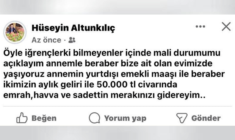 Hüseyin Altunkılıç ise, bir süre sonra paylaşımını sosyal medya hesaplarından kaldırdı.