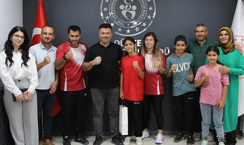 Düzce Gençlik ve Spor İl Müdürü İsa Yazıcı, Bosna Hersek Banja Luka’da düzenlenen 2024 Üst Minik Erkekler ve Kadınlar Avrupa Boks Şampiyonası’nda üst minik kadınlar kategorisinde ikinci olan sporcu Aleyna Eylül Yılmaz, Antrenörleri Yunus Payar ve Derya Oktay’ı ağırladı.