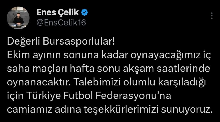 Ekim ayının sonuna kadar oynayacağımız iç saha maçları hafta sonu akşam saatlerinde oynanacaktır. Talebimizi olumlu karşıladığı için Türkiye Futbol Federasyonu’na camiamız adına teşekkürlerimizi sunuyoruz.”