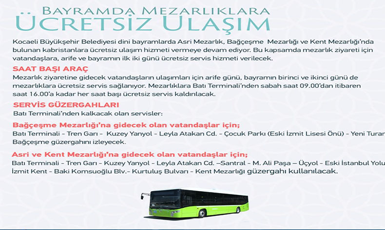 Kocaeli Büyükşehir Belediyesi dini bayramlarda Asri Mezarlık, Bağçeşme Mezarlığı ve Kent Mezarlığı’nda bulunan kabristanlara ücretsiz ulaşım hizmeti vermeye devam ediyor. Bu çerçevede, mezarlık ziyareti için vatandaşlara arife ve bayramın ilk iki günü ücretsiz servis hizmeti verilecek.