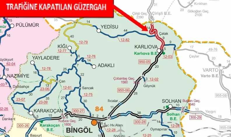 Bingöl Valiliğinden yapılan açıklamada; “Bingöl-Erzurum Devlet Yolunun 20-49 km’leri arası yoğun kar yağışı ve tipi nedeniyle saat 10.55 itibari ile TIR trafiğine kapatılmıştır” denildi.