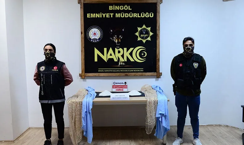 Bingöl İl Emniyet Müdürlüğüne bağlı Narkotik Suçlarla Mücadele Şube Müdürlüğü ekipleri, uyuşturucu madde imal ve ticaretini önlemek amacıyla çalışma gerçekleştirdi. Kentte, Doğu illerinden gelen kargo firmaları aracılığıyla uyuşturucu madde sevkiyatı yapılacağı yönünde istihbarat alınması üzerine kargo firmaları çevresinde tertibat alındı. Bir şüpheli üzerinde yapılan çalışmada, kargo poşetine konulan perdelerin arasına saklanmış vaziyette 1 kilo 981 gram metamfetamin ele geçirildi.