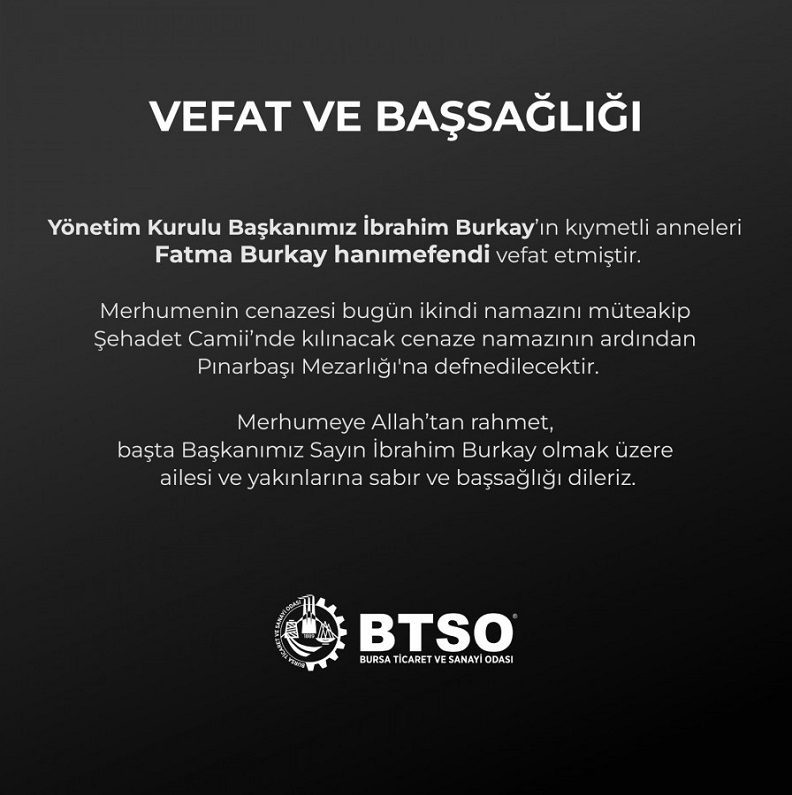 BTSO Yönetim Kurulu Başkanı İbrahim Burkay’ın annesi Fatma Burkay hayatını kaybetti. Fatma Burkay’ın cenazesi ikindi namazının ardından Pınarbaşı Mezarlığı’na defnedilecek.