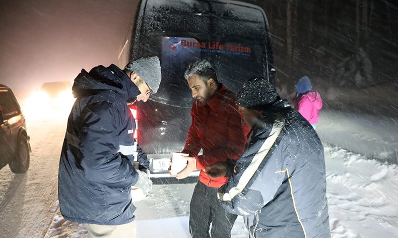 Hafta sonu tatilini Uludağ’da geçiren vatandaşların eş zamanlı dönüşe geçmeleri, yolda yığılmalara neden oldu. Özellikle Oteller Bölgesi-Milli Parklar arasındaki bölümde ‘yol açık olmasına rağmen’ bazı araçların kontrolden çıkıp kayması yüzünden trafik durma noktasına geldi. Büyükşehir ve Karayolları ekipleri, ‘yol açma çalışmasının yanında’ kontrolden çıkıp kara saplanan araçların kurtarılması için yoğun çaba harcadı. Bu arada, BURFAŞ ekipleri de yolun kapalı olduğu sıralarda araçlardaki vatandaşlara sıcak çorba ikramında bulundu. Yol boyunca devriye atan BURFAŞ ekipleri, dondurucu soğuk ve tipiye rağmen vatandaşların içini ısıtmak için yoğun çaba harcadı.