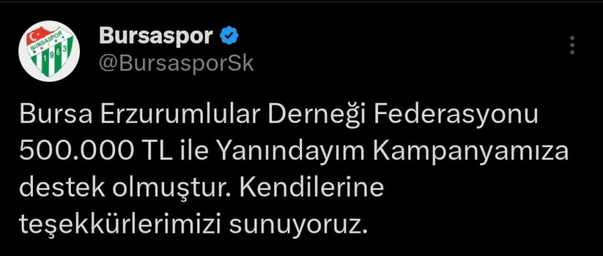 Bursaspor Kulübü resmi sosyal medya hesaplarından yaptığı açıklamada, Bursa Erzurumlular Derneği Federasyonu’nun yeşil beyaz’lıların yanındayım kampanyasına 500.000 tl ile destek olduğunu duyurdu.