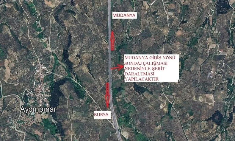 Bursa Büyükşehir Belediyesi, Bursa-Mudanya Karayolu üzerinde yapılacak altyapı çalışmaları nedeniyle trafik düzenlemesine gidileceğini duyurdu. Aydınpınar mevkiini kapsayan düzenleme kapsamında, Mudanya yönüne gidişte yolun en sağ şeridi geçici olarak daraltılacak.