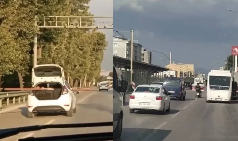 Diğer bir görüntüde ise otomobil sürücüsü demir boruyu aracının bagajını açarak otomobilin içinden geçirerek taşıdı. O anlar cep telefon kamerasına yansıdı.