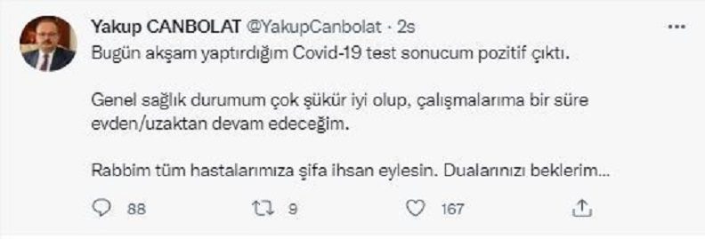 “Bugün akşam yaptırdığım Covid-19 test sonucum pozitif çıktı. Genel sağlık durumum çok şükür iyi olup, çalışmalarıma bir süre evden, uzaktan devam edeceğim. Rabbim tüm hastalarımıza şifa ihsan eylesin. Dualarınızı beklerim.” ifadelerini kullandı.