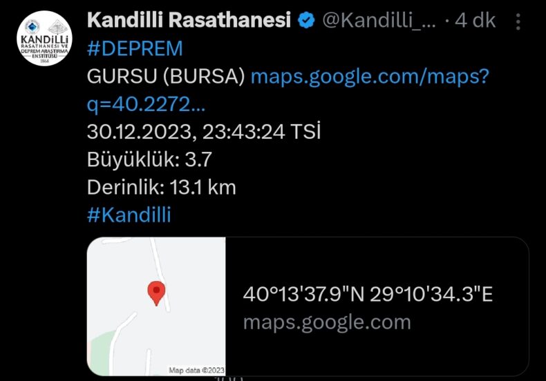 Kandilli Rasathanesi’nden yapılan açıklamada merkez Üssü Gürsu olan ve Saat 23:43 sıralarında meydana gelen depremin büyüklüğü 3.7 olarak belirlendi.
