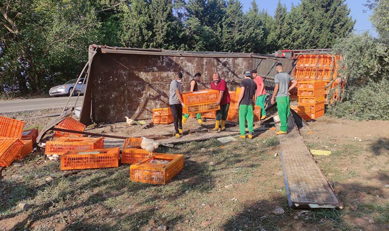 Alınan bilgilere göre, Bilecik’in Osmaneli ilçesinden yüklediği 5 bin adet canlı tavuğu Bandırma’ya götürmek üzere yola çıkan Bora V. idaresindeki TIR kontrolden çıkarak devrildi. Kazada tır kasasında yüklü olan canlı tavuklar kafesleri ile birlikte etrafa saçıldı.