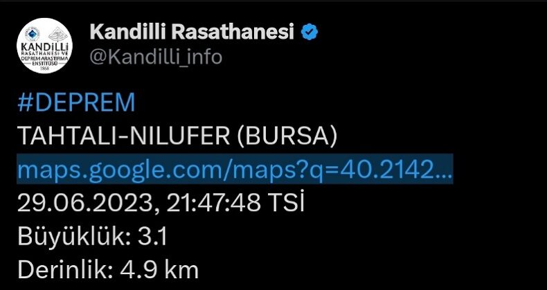 Kandilli Rasathanesi’nden edinilen bilgilere göre Bursa Nilüfer Tahtalı’da 3.1 büyüklüğünde deprem meydana geldi.