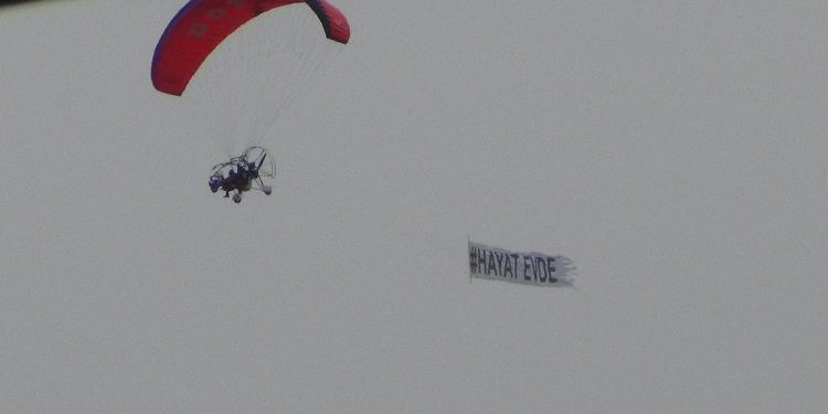 Yeniceköy’de bulunann Doğa Sporları ve Turizm Merkezi’nden (DOSTUM) paramotorla havalanan eğitmen İbrahim Dinçer, İnegöl semalarında “Hayat Evde” yazılı pankartla uçuş yaparak halkın dikkatini çekmeye çalıştı.
