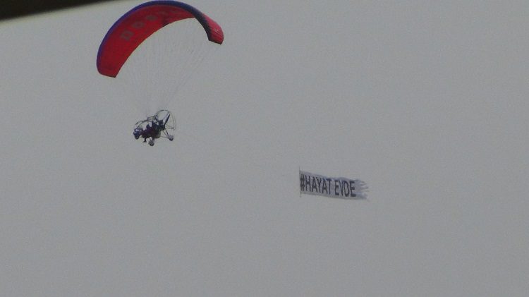 Yeniceköy’de bulunann Doğa Sporları ve Turizm Merkezi’nden (DOSTUM) paramotorla havalanan eğitmen İbrahim Dinçer, İnegöl semalarında “Hayat Evde” yazılı pankartla uçuş yaparak halkın dikkatini çekmeye çalıştı.