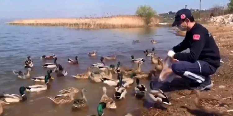 Yaban ördeklerini unutmayan Nilüfer Jandarma Asayiş Bot Komutanlığına bağlı ekipler, araçlarla getirdikleri yemleri bölgeye bırakıp, göldeki yaban hayvanlarının aç kalmasını önledi.