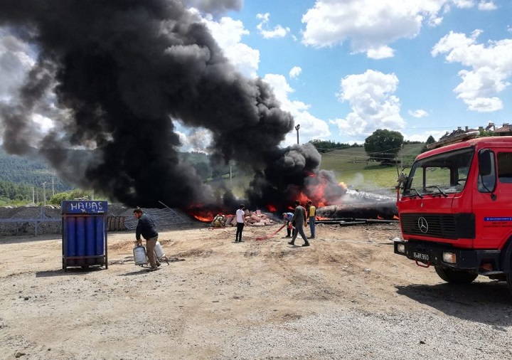 Simsiyah renkteki yoğun duman göğe yükselirken, ihbar üzerine bölgeye itfaiye ekipleri sevk edildi.