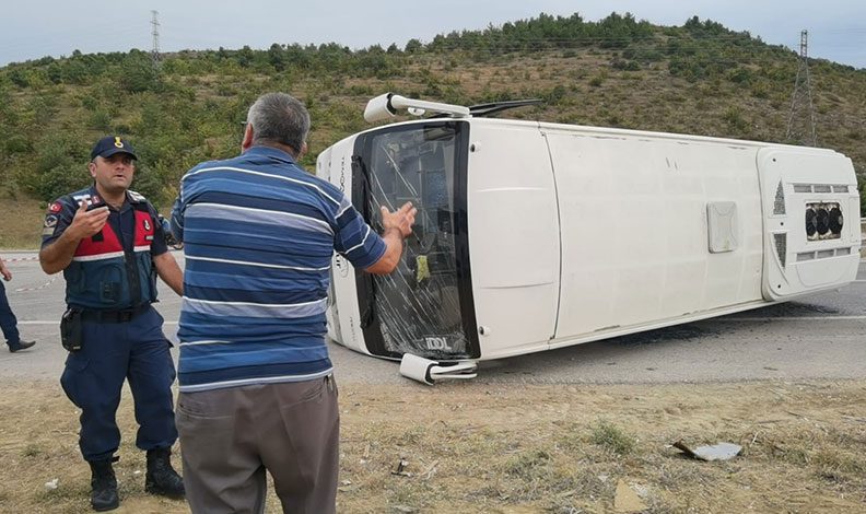 İnegöl’den Mobilya İhtisas Organize Sanayi bölgesinde faaliyet gösteren bir fabrikadaki işçileri almak için yola çıkan sürücü Mesut G. (55) yönetimindeki servis otobüsü, Hamzabey Mahallesi mevkiinde yol çalışması nedeniyle kapatılan yolu son anda fark etti. Frene basan sürücünün kontrolünden çıkan otobüs yol üzerine devrildi. Sürücü kazayı burnu bile kanamadan atlattı.