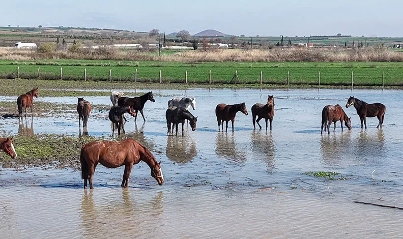 Uluabat Gölü, Bursa-İzmir kara yolunun kıyısına kadar gelirken bölgede bulunan milyonluk yarış atlarının bulunduğu tarlalar da su altında kaldı. Arap ve İngiliz yarış atları, su içinde gezinirken drone ile görüntülendi. Milyonluk tayların annesi olan damızlık atların büyük kısmının gebe olması da dikkat çekti.