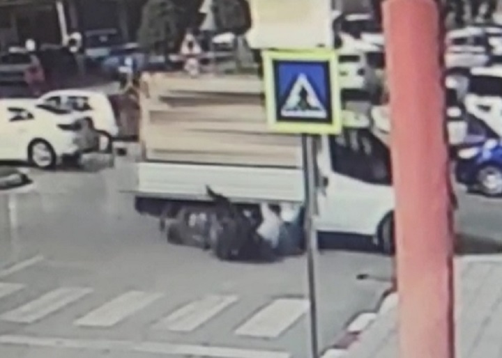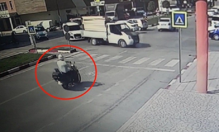 Bursa’da, sürücüsünün kavşaktan dönüş yaptığı kamyonete çarpan, motosiklet sürücüsü Ersin Tarım (45) yaralandı. Kaza anı, iş yerinin güvenlik kamerasına yansıdı.