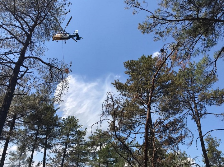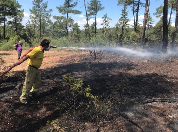 Orhaneli Orman İşletme Müdürlüğüne ait 4 arazöz, 5 su tankeri ve helikopterle alevlere müdahale eden ekipler, yangını kısa sürede söndürdü.